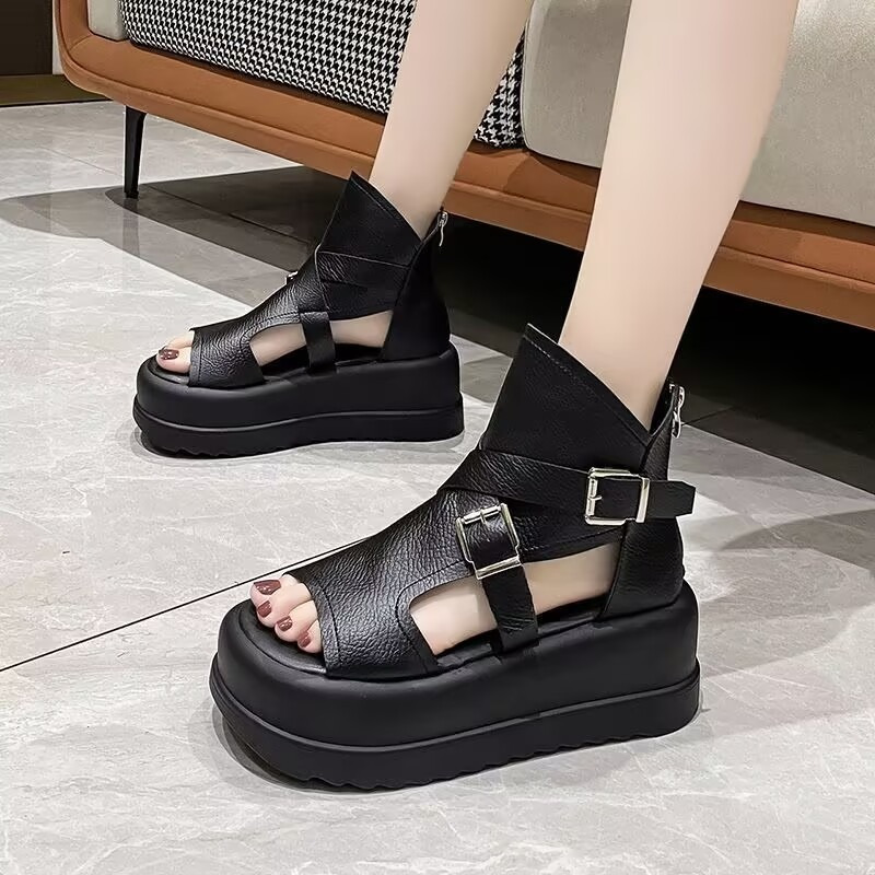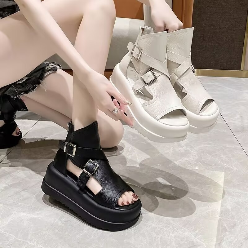 Women'S Fashionable Thick Sole Sandals - Beige, Open-Toe, Buckle Closure, Flat Heel, Synthetic Upper & Insole, Rubber Sole, Casual Footwear|Buckle Closure Sandals|Rubber Sole Sandals