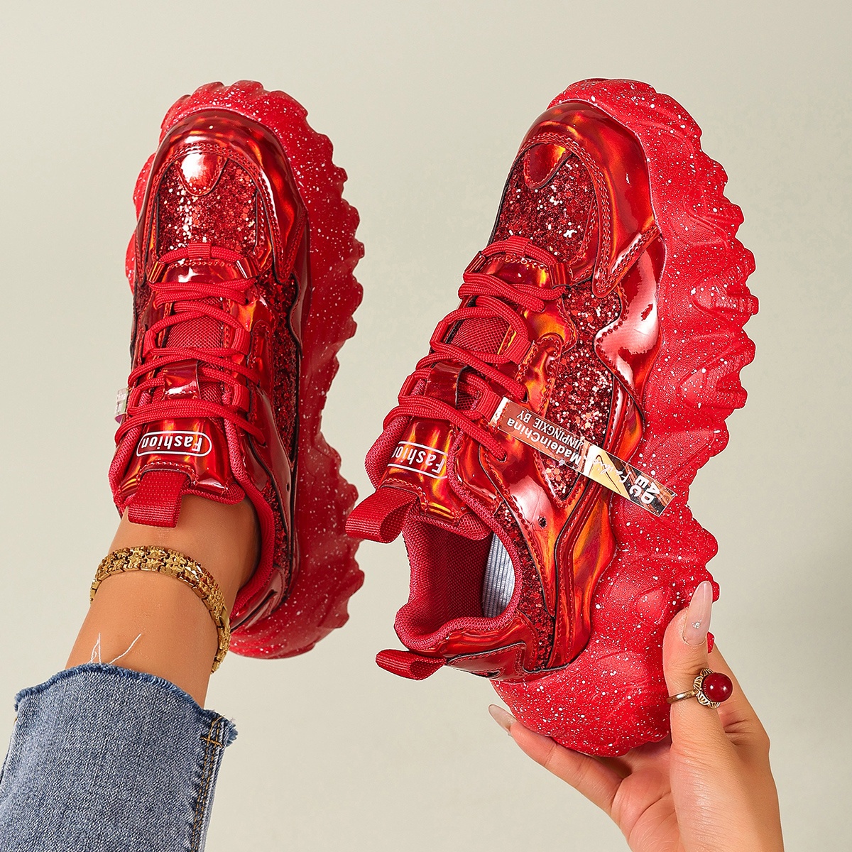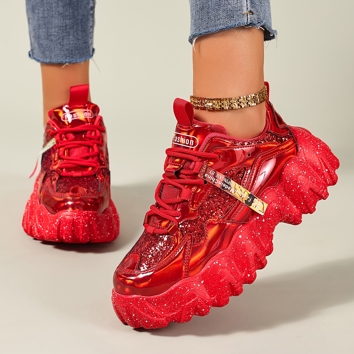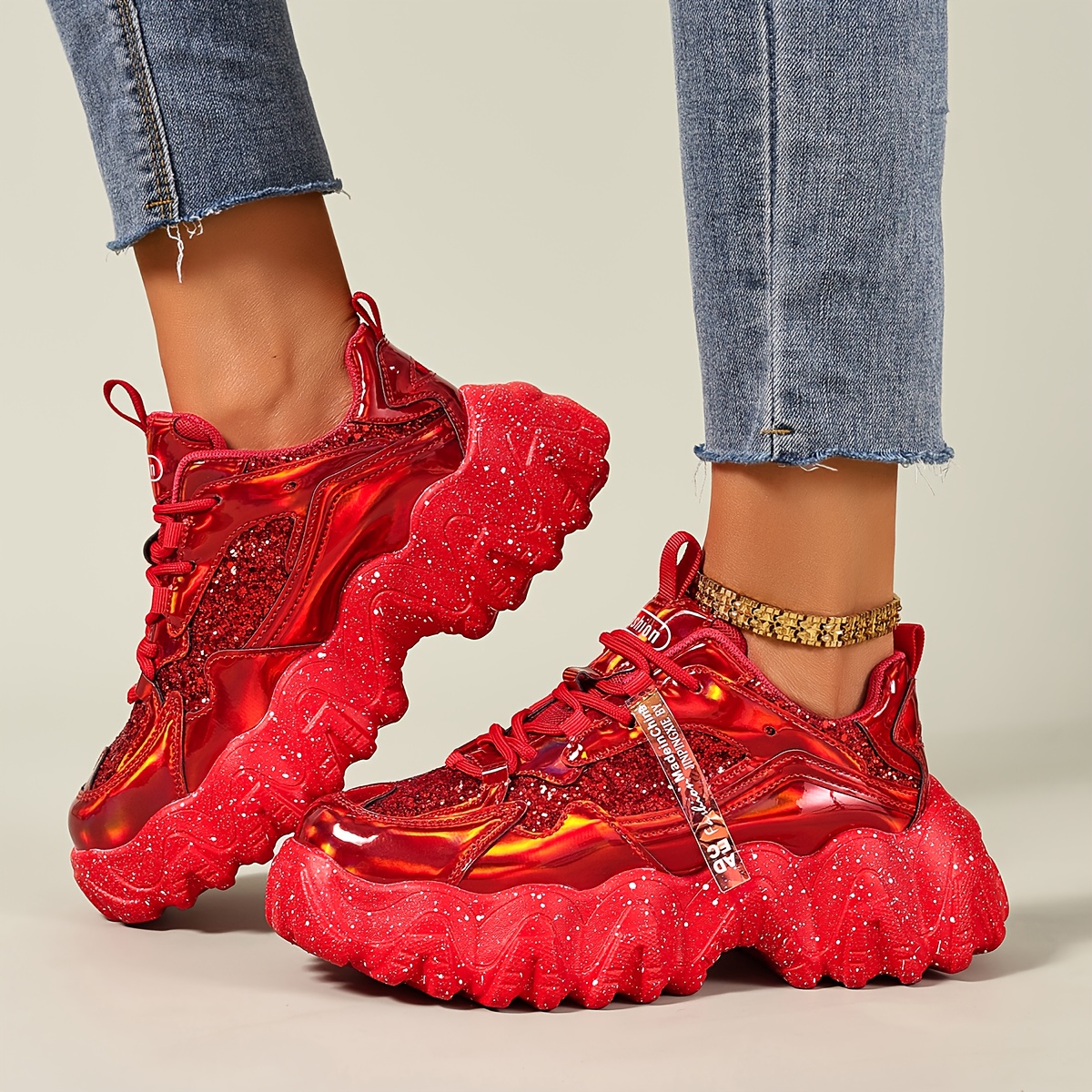 Women'S Red Glittery Platform Sneakers - Trendy Thick Sole, Comfortable & Easy to Wear, Lace-Up Low-Top Design with Round Toe, PU Cover Upper & Rubber Sole for All-Season Fashion, Ladies Sneakers, Shoe/sneaker For Women