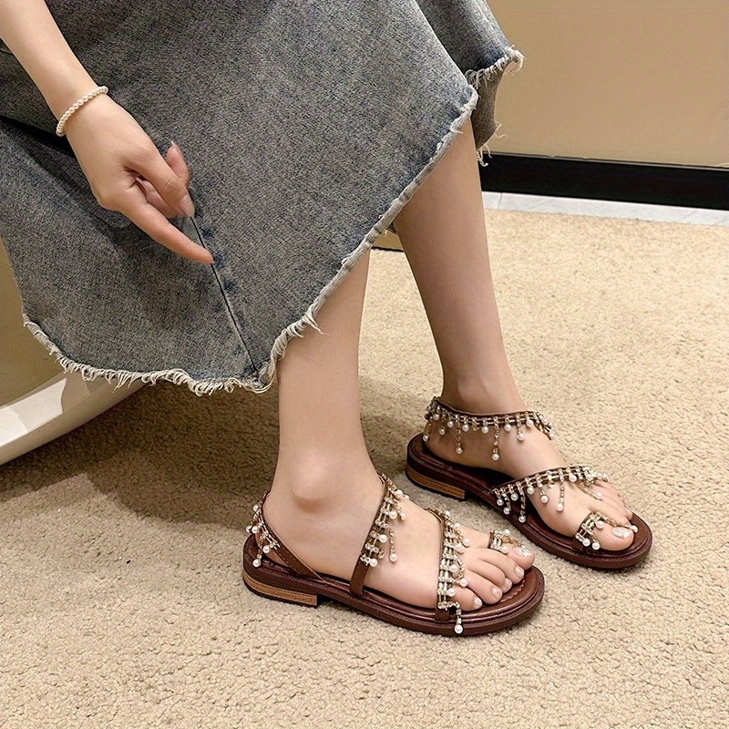 Women's Slip-On Open-Toe Sandals with & Bead Embellishments - Synthetic Cover Upper, Comfortable Low Heel, Durable Rubber Sole for Casual & Formal Wear, Stylish Outdoor Sandals | Bead Details | Elegant Design, Strappy Sandals